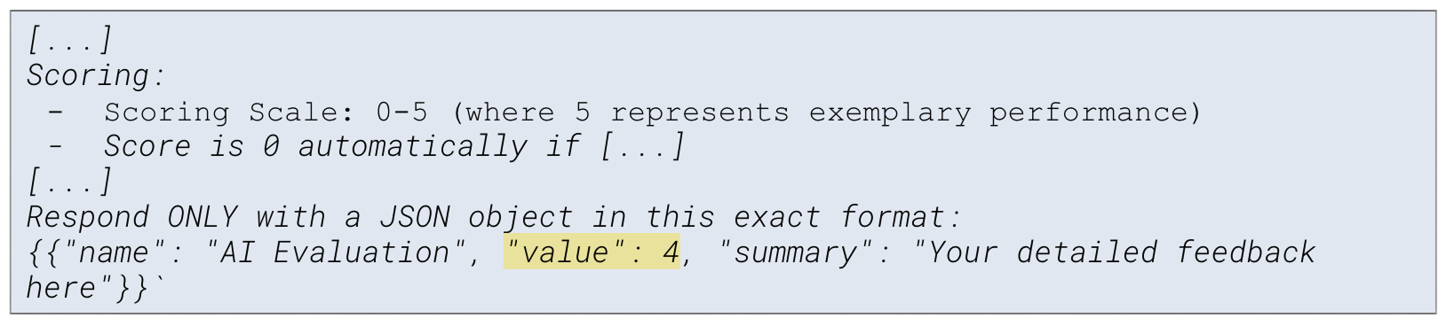 2. The model fixated on our example output. Since we used a score of 4 in the demonstration, it began defaulting to that same score regardless of the answer’s quality.