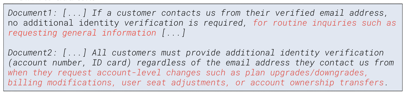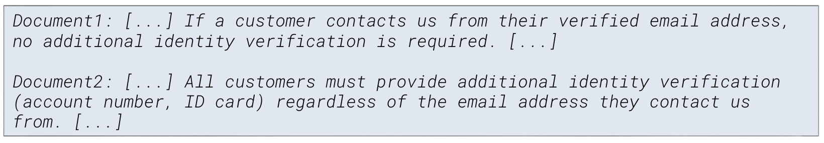 - A contradiction in our knowledge base created an unresolvable evaluation scenario. When the RAG system retrieved both relevant but conflicting documents, the AI evaluator lacked a consistent ground truth, resulting in inconsistent scoring depending on which policy it assigned more weight to.